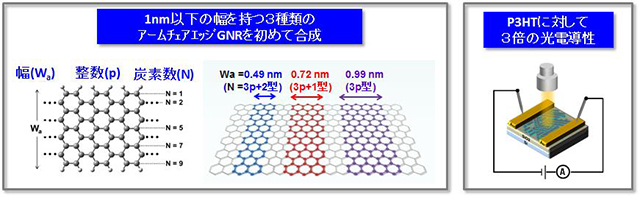 今回開発した「ラジカル重合型-化学気相成長法」は、2ゾーン独立加熱を用いることで、原料分子から非常に高密度にラジカル中間体を発生させて金属基板に吹きかけることにより、低真空(1Torr)にもかかわらず、従来法の10倍の高効率でさまざまな線幅を持つ極細GNRの合成に成功しました。この極細GNRのフィルムは、従来の有機太陽太陽電池に用いられる共役系高分子(ポリ3-ヘキシルチオフェン)の3倍の光電導性を示し、高効率太陽電池材料としての応用が期待されます。