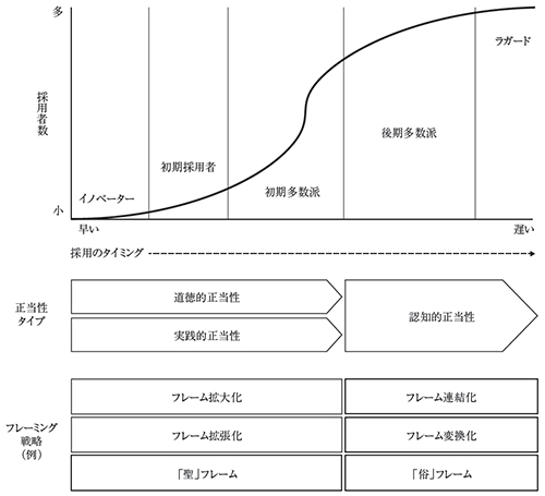 図:イノベーション普及の段階、正当化、そしてフレーミング戦略(注:イノベーション普及の段階は、ロジャーズ([1962] 2003)の採用者カテゴリーを採用している。)
