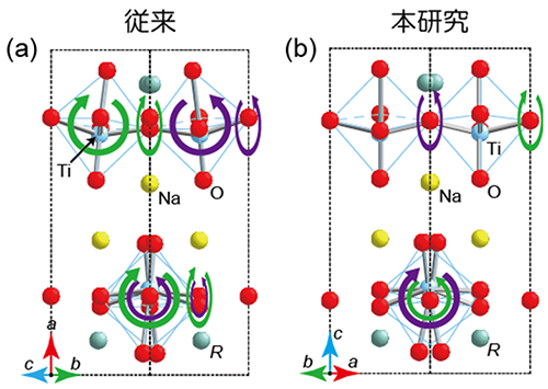 図:(a)従来報告されていた結晶構造(中心対称性あり)と(b)今回の研究で報告した結晶構造(中心対称性なし)。(a)と(b)では異なるBO6酸素八面体回転パターンを示し、(b)のパターンが中心対称性の破れをもたらす。