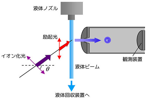 真空中に液体ノズルから液体ビームを噴射し、二つのレーザーパルスを照射し、生じる電子(光電子)の量を測定する。第一レーザーバルス(励起光)を照射後に遅延時間をおいて、第二レーザーパルス(イオン化光)で光電子を発生させる。イオン化光の偏光の電場ベクトルと光電子の速度ベクトルのなす角をθとし、光電子強度のθ依存性を遅延時間の関数として観測した。液体ビームは、装置の真空度を保つために、液体窒素温度に冷却された液体回収装置で凍結させて回収される。