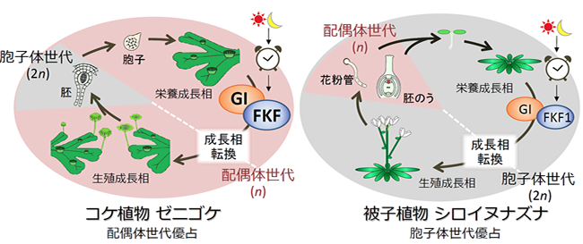 植物にとって季節を感知して花を咲かせることは、一生を通じて最も重要なイベントの一つです。植物は体内に持つ概日時計を利用して昼夜の長さを測ることで季節を認識し、最適な季節に繁殖することで自らの生存・繁栄を最適化しています。このような季節に応じて成長相を転換する仕組みは主に被子植物の花成をモデルとして研究が進められました。その結果GIとFKF1と呼ばれるタンパク質から構成される複合体が、その中心的な役割を担うことが明らかにされていました。GI-FKF1複合体は、コケ植物をはじめとするより祖先的な陸上植物ではその存在が知られていませんでした。そのため、GI-FKF1複合体による成長相制御機構は植物の進化上、維管束植物の出現と前後して獲得された機構であると考えられてきました。