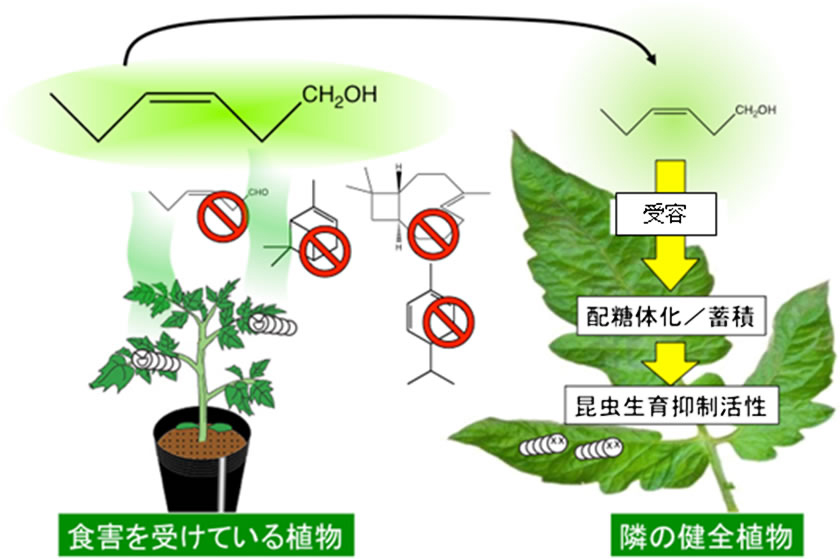 本研究グループは、トマトとその害虫の一つであるハスモンヨトウ幼虫を用いた実験で、健全なトマトは幼虫に食べられている隣の植物から漂ってきた香り物質群の中から、青葉アルコールを取り込んで自分の体の中で糖と結合させることを発見しました。この反応は、香り成分の一つである青葉アルコールを植物が受容する仕組みと言えます。全く分かっていなかった植物の香り受容機構の中の一つが世界で初めて明らかになりました。さらに糖と結合させることで無毒の青葉アルコールが幼虫に対する抵抗物質になることも分かりました。植物の新しい防衛の形です。