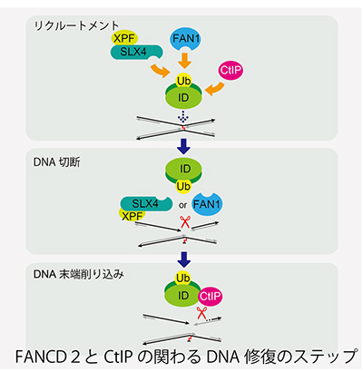 FANCD2とFANCIにより形成されるID複合体はDNA損傷に応答してユビキチン化され、DNA切断のはさみとして機能するFAN1タンパク質、SLX4-XPF複合体をリクルートします。それとは独立に、今回発見されたCtIPタンパク質もリクルートされます。その後、FAN1とSLX4などの働きでDNAが切断され、その後、CtIPが切断された末端を削り込みます。削り込みステップは、その後のDNA相同組換えのための必須のプロセスです。