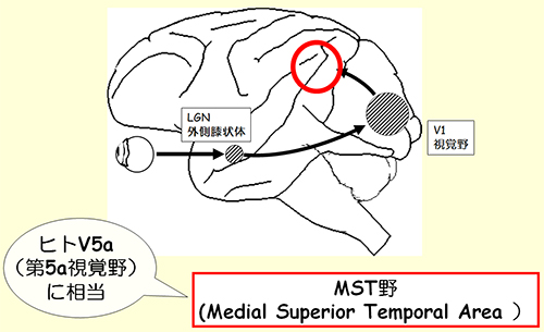 図: 「動き」を処理する脳部位とそこに至る視覚情報の流れ(サル)