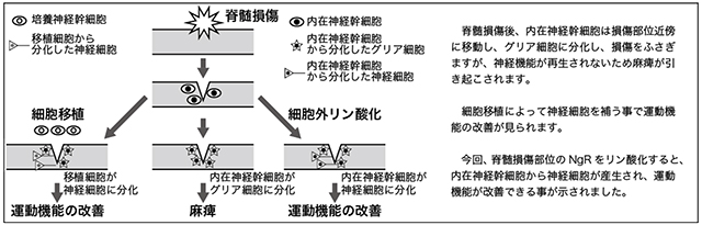 本研究グループは、神経組織再生を阻害するタンパク質NgRの細胞外部分をリン酸化すると、その活性化を阻害できることを以前に報告しましたが、今回の研究成果では、NgRが神経幹細胞に発現しており、その神経細胞産生能力を抑制していることを見い出しました。ラット脊髄損傷モデルで脊髄のNgRを抑制したところ、損傷部位近くで神経細胞が新生され、下肢の麻痺が大幅に改善されました。成熟した脊髄での神経細胞産生能力を亢進できること、亢進された内在神経細胞産生能力は損傷を治癒できることが示されました。