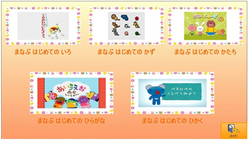 - 人気アニメの動画、画像、文字、読み上げにより、健常児と一緒に重度の身体障害児も対話感覚で、ほめてもらったり、教えてもらいながら「いろ」「かたち」「かず」「ひかく」「ひらがな」の意味を楽しく学べる。