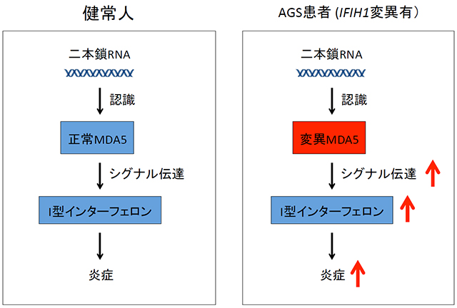 今回、本研究チームは本邦におけるAGS患者の全国調査において過去に同定された17人の患者のうち、既報告遺伝子に変異を認めない3人の患者においてエクソーム解析を行い、3人全員にIFIH1遺伝子変異を同定しました。これらの変異は遺伝子変異データベースに登録がなく、非常に稀であると考えられました。IFIH1遺伝子のコードするMDA5は細胞質内の核酸受容体の一つであり、MDA5受容体に二本鎖RNAが結合することにより、MDA5タンパクが重合することが引き金となって、I型インターフェロンの産生が生じます。今回の3種の変異の効果を調べるため、本研究チームは培養細胞にこれらの変異を有するIFIH1遺伝子を導入しました。するとこれらの細胞の中では下流のI型インターフェロンの発現や、インターフェロンにより制御される下流の遺伝子の発現が亢進することがわかり、同定した3種のIFIH1遺伝子変異が確かにAGSの原因であることが証明されました。