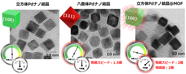 今回、本研究グループは、形状制御したPdナノ結晶を作製することにより、Pd結晶表面の原子配列を精密にコントロールし、水素の吸蔵スピードを変えることに成功しました。さらに、Pdナノ結晶の表面を有機配位子と金属イオンからなるMOFで被覆することにより、Pdの水素吸蔵量、水素吸蔵・放出スピードなどの水素吸蔵特性が飛躍的に向上することを発見しました(図)。この研究成果は、ナノ結晶表面の構造制御やMOFによる被覆化により、金属の材料特性が格段に向上することを示しており、今後、さまざまな金属とMOFとの組み合わせにより、革新的な材料が創製されると期待されます。