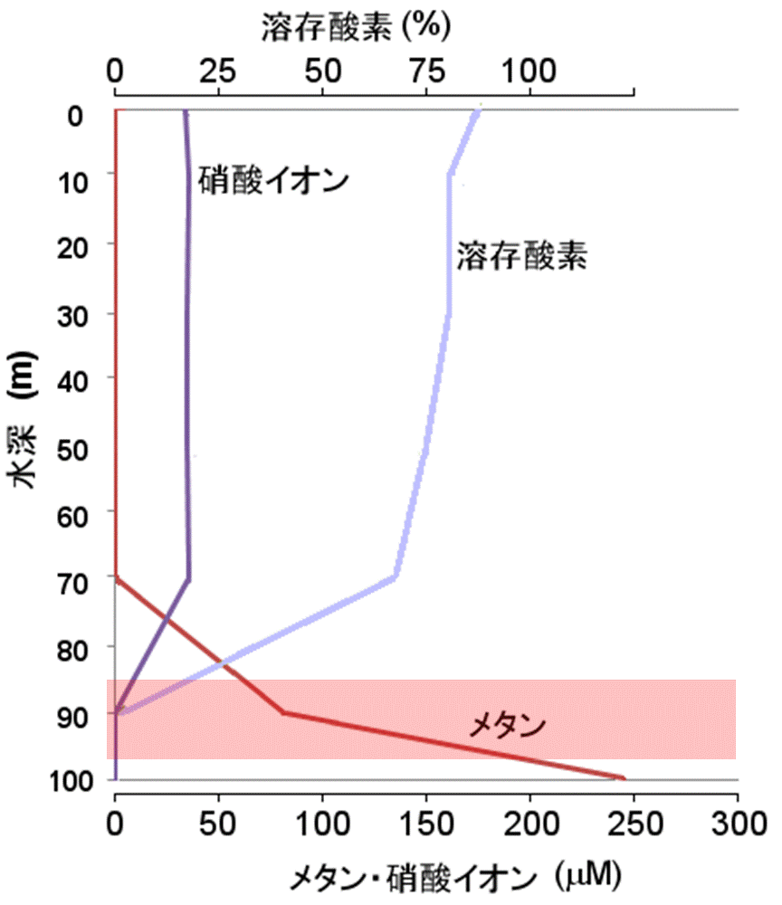 図:調査地点での湖水環境と脱窒メタン酸化細菌の生息環境の概要。溶存酸素が枯渇し、メタンが供給される水深90m付近(図中着色部)で脱窒メタン酸化細菌が優占していた。