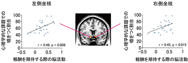 その結果、報酬(今回の研究ではお金)を期待する際の「側坐核(そくざかく)」と呼ばれる脳領域の活動が高い人ほど、嘘をつく割合が高いことがわかりました(図)。さらに、側坐核の活動が高い人ほど、嘘をつかずに正直な振る舞いをする際に、「背外側前頭前野(はいがいそくぜんとうぜんや)」と呼ばれる領域の活動が高いこともわかりました。