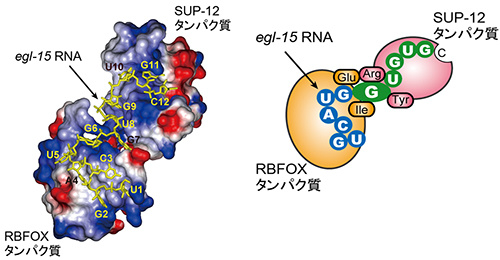 図:二つのタンパク質RBFOXとSUP-12により協働認識されたegl-15遺伝子のRNAの立体構造の表面電荷モデル(左)と模式図(右)。7番目の塩基Gが二つのタンパク質にサンドイッチされている。