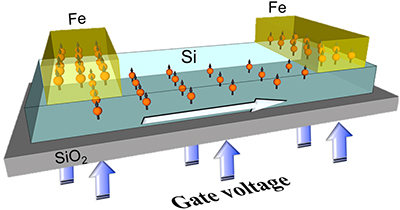 鉄(Fe)からシリコン(Si)に注入されたスピンの伝導はシリコン基板側にあるBack gateから印加するゲート電圧(Gate voltage)によって制御する。