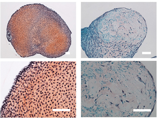 軟骨組織の構造体である細胞外マトリックスは赤色に染色される。誘導42日後、TD1-iPS細胞株では軟骨の形成に異常が見られた。
