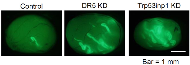その結果、精子幹細胞におけるDNAダメージはTrp53(p53)-Trp53inp1-Tnfrsf10b(DR5)経路を活性化し、その細胞死を誘導することを明らかにしました。この経路は分化の進んだ精子前駆細胞で重要となるBbc3(Puma)を介した細胞死の経路とは異なっており、今回の発見は幹細胞と分化決定された前駆細胞が異なった細胞死のメカニズムを利用することを示すものです。