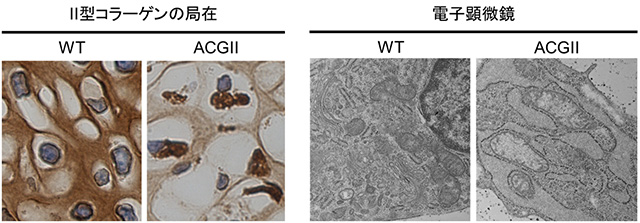 (左)Ⅱ型コラーゲンの免疫染色(Ⅱ型コラーゲンが茶色に見える)、(右)電子顕微鏡観察像、WT:健常な人由来、ACGII:患者さん由来