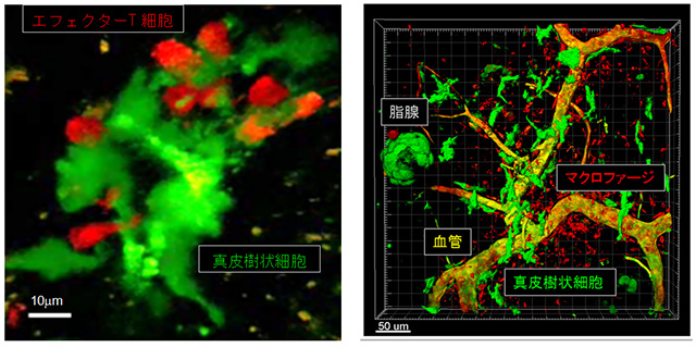 (左)真皮樹状細胞とエフェクターT細胞の集簇、(右)血管周囲に集簇する真皮樹状細胞とマクロファージ