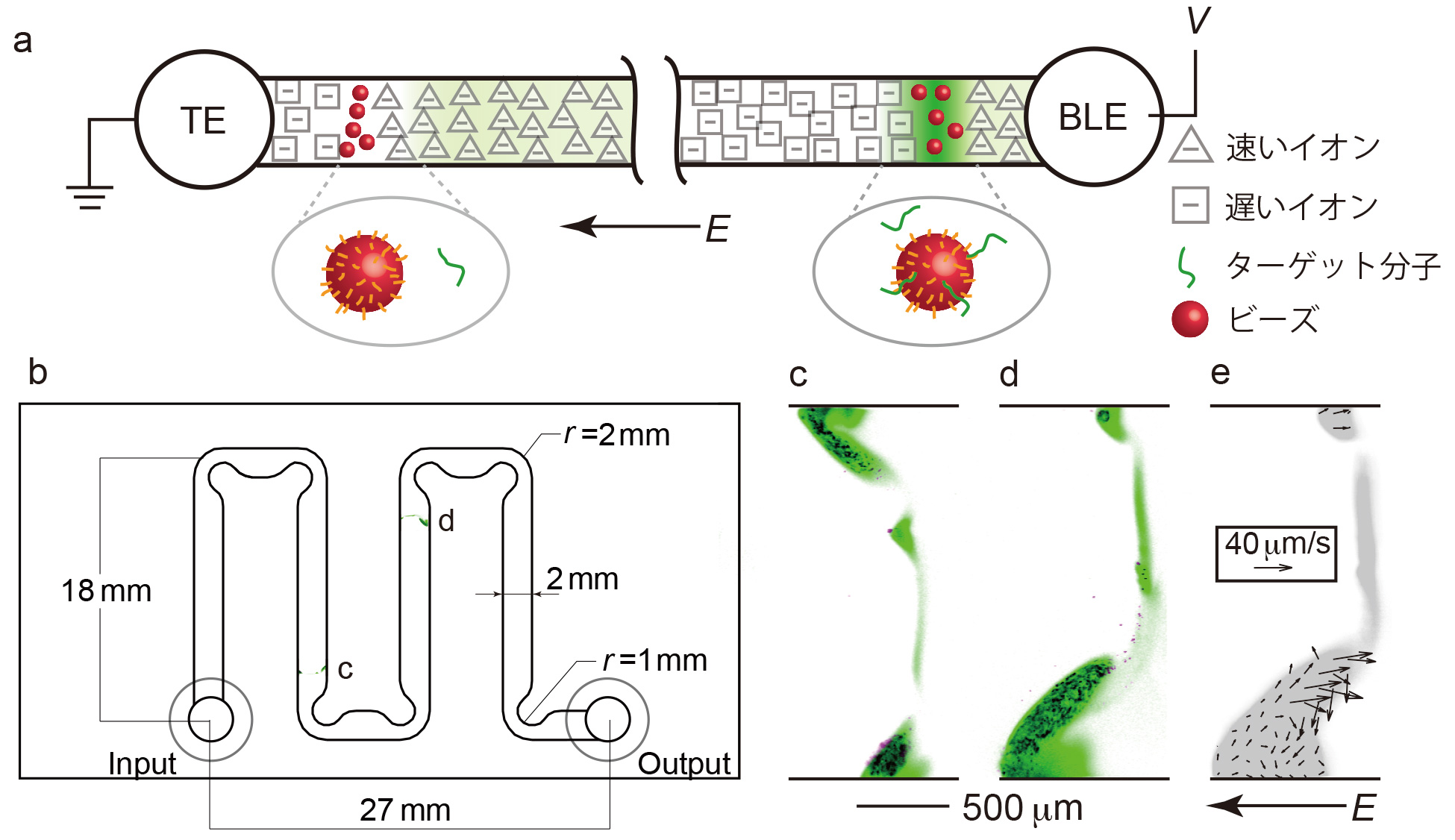 図:(a)開発した高速DNA反応法の概念図。速いイオンと遅いイオンの中間の電気泳動速度を有するターゲット分子とビーズが等速電気泳動法により共濃縮されることにより、ビーズ表面の捕捉分子とターゲット分子の反応が高速化される。(b)試作したマイクロ流路。深さ約130μm。(c、d)ターゲット分子とビーズの共濃縮状態の可視化写真。(図b中に示したcおよびdの位置に対応。ピンク:ビーズ、緑:ターゲット分子)(e)濃縮層内部におけるビーズの流動。この内部流動によりさらに反応が促進される。