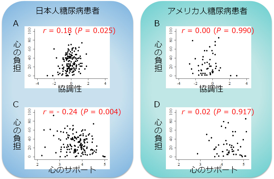 A、B:協調性(横軸)と糖尿病負担感(縦軸)の関係。Aの日本人では協調性を重視する人ほど負担感が強いという関係がありますが、Bのアメリカ人では明らかではありません( r :相関係数、P:統計学的過誤率)、C、D:周囲からの心のサポート(横軸)と糖尿病負担感(縦軸)の関係。Cの日本人ではサポートを強く実感している人ほど負担感が軽減しているという関係がありますが、Dのアメリカ人ではそのような関係がみられません。