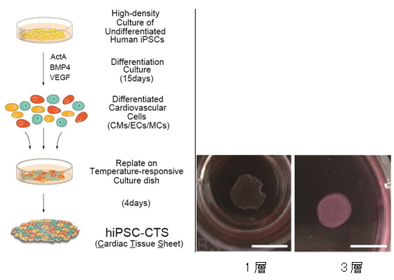 そこで本研究グループは、より細胞の生存・生着を高めるような移植方法として温度感受性培養皿を用いた細胞シート技術(東京女子医科大学)に着目し、この細胞シート技術をヒトiPS細胞から分化誘導した心臓構成細胞に用いることにより、心臓組織を模した「心臓組織シート」を作製し、さらに、それを心疾患動物モデルに移植することで、治療効果および細胞生着効果を検証しました。