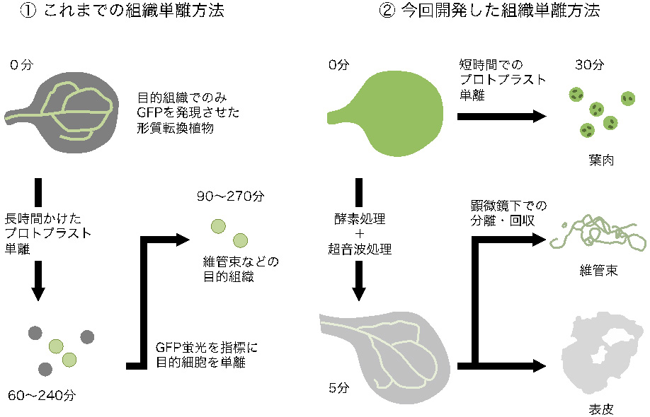 - これまでの方法では、緑色蛍光たんぱく質GFPを植物の組織特異的に発現させ、プロトプラスト(酵素処理により細胞壁を取り除いた植物細胞)を単離し、さらにGFPを指標に目的の組織を単離していた。この方法では単離した組織の純度は高いが、時間がかかってしまうため(1時間30分~4時間30分程度)、時間とともに発現が変化する体内時計の解析には不向きであった。