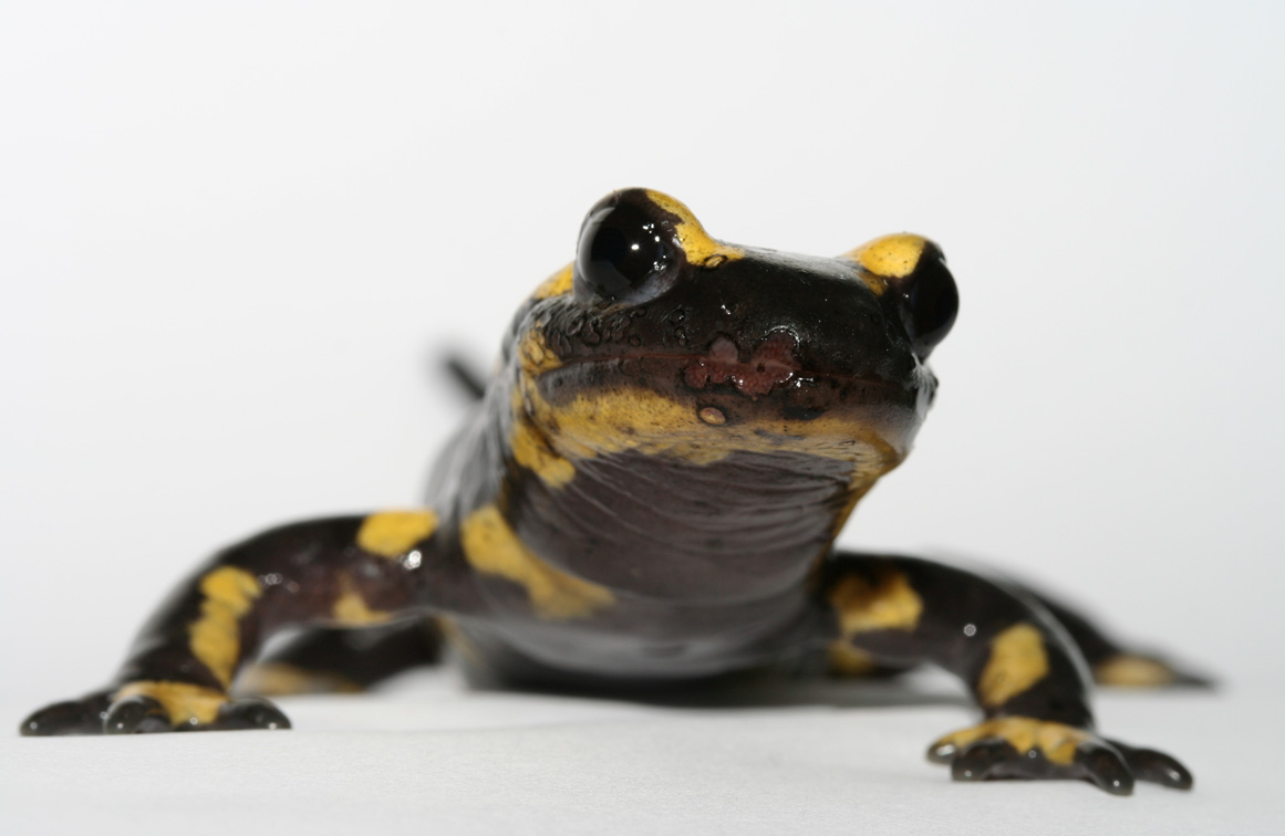 ヨーロッパに広く分布するマダラサラマンドラ。口まわりの皮膚がイモリツボカビ菌により炎症を起こしている。(Ghent 大学(ベルギー)A. Martel氏提供)