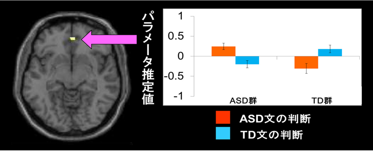 ASD群がASD文を判断し、TD群がTD文を判断する際に、腹内側前頭前野が有意に活動しました。なお、この脳部位において、自己判断課題と他者判断課題との間に活動の有意差はありませんでした。
