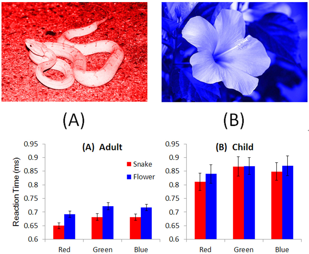 図:(上)実験に用いられた刺激の例。左が赤いヘビ、右が青い花。(下)ヘビと花の写真への赤、青、緑の色ごとの反応時間の比較。左が成人、右がこども。いずれの場合もヘビの写真の時のほうが、花よりも色の回答に要した時間が短いことがわかる。