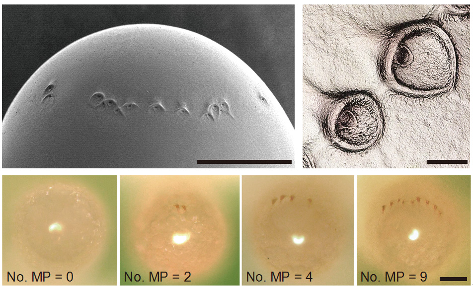 シロアリの卵の表面には精子が入るための孔(卵門)が開いています(上図)。多くの卵の卵門を色素で染めて調べると、一部の卵には卵門がないことが分かりました(左下図)。右から卵門数9、4、2、0。