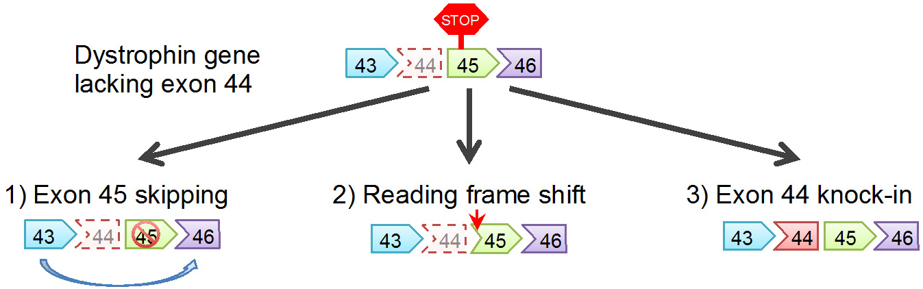 44番目のエクソンが欠損すると遺伝子の読み枠が変わり、45番目のエクソンの途中でタンパク質の合成がストップしてしまい、異常なタンパク質となる。そこで読み枠を戻し、タンパク質の合成が最後まで進むようにするために上記三つの戦略を立てた。