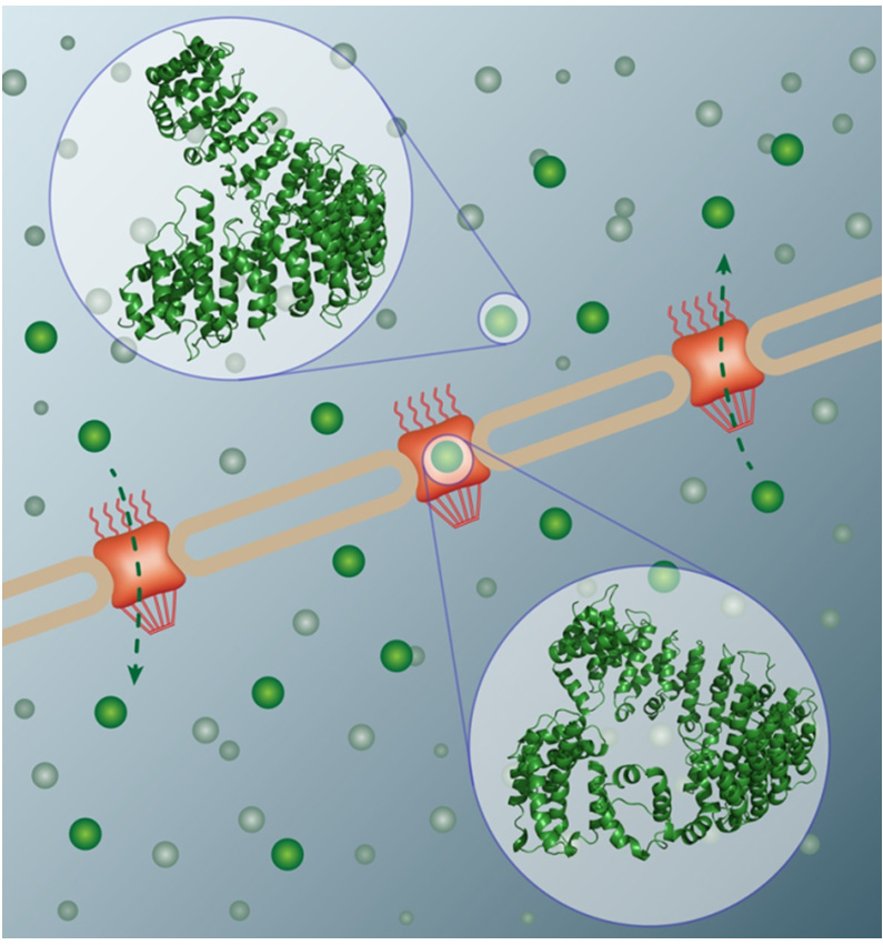 バネのような構造をしたタンパク質の構造が柔軟に変化することにより、分子が密集した孔内部の空間を通り抜けるとこができる。
