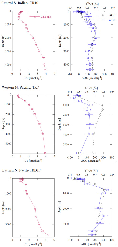 インド洋(上)、北西太平洋(中)、北東太平洋(下)の各海域における銅濃度深度分布(左図)と、銅同位体比(青線)およびAOU(みかけの酸素消費量:黒点線)の相関関係(右図)