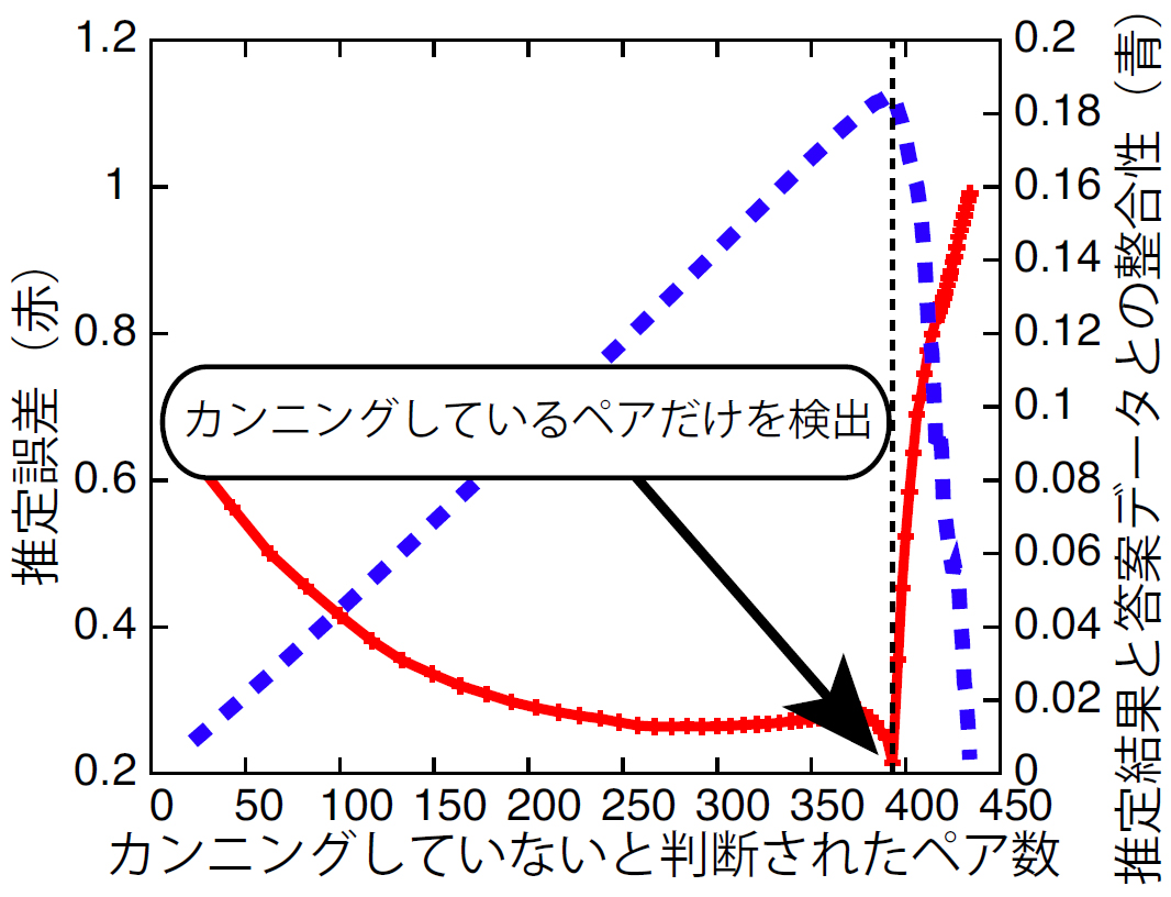 30人クラスの場合に想定される435ペアのうち、1割程度がカンニングをしているケース。青の線が推定結果と答案データとの整合性を表している。この整合性が減少に転じるまで被験者を信じる。減少に転じたとき、残りの被験者間で実際にカンニングをしていた。
