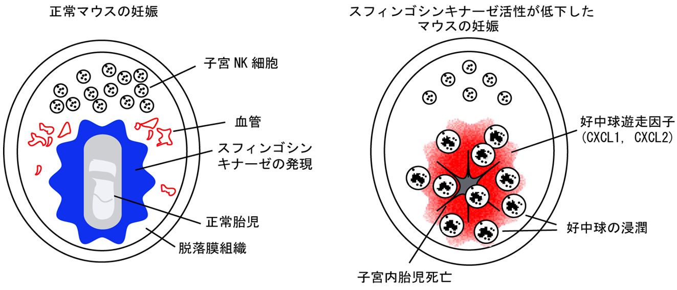 胎児は父親の遺伝子を半分受け継いでいます。胎児が「移植片」として母体内で拒絶されずに平和的に共存するためには、免疫系の制御が必要になります。正常マウスの妊娠初期では、スフィンゴシンキナーゼは胎児を取り囲む脱落膜領域に過剰に発現し、母親の免疫系による攻撃から胎児を保護しています。一方、スフィンゴシンキナーゼが欠損したマウスの妊娠初期では、胎児は免疫系の攻撃から保護されず、胎児を囲む脱落膜領域にCXCL1、CXCL2などの好中球遊走因子が過剰に発現していました。