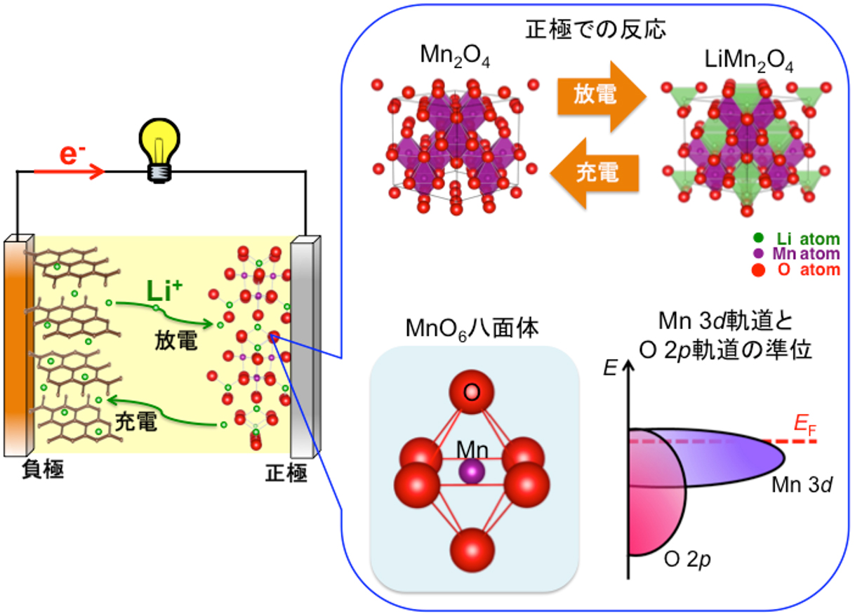 リチウムイオン二次電池では、リチウムイオンが正極、負極間を移動することで充放電が行われます。母材のマンガン酸(Mn 2 O 4 )は、酸素原子でつくる八面体の中心にマンガン原子が存在する構造を持つため、リチウム挿入によってもたらされた電子の入る軌道(電池電極反応に寄与する軌道)としてマンガン3 d 軌道、もしくは、酸素2 p 軌道のどちらかが予想されます。