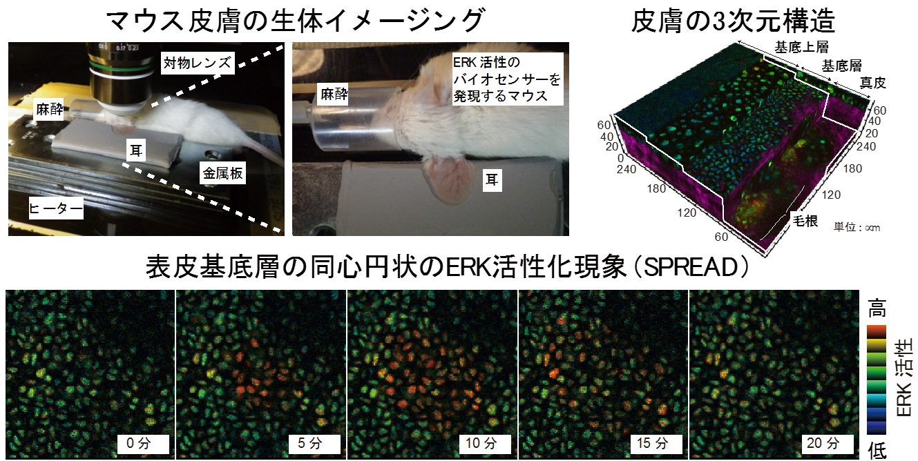 さらに、このスプレッドという現象は、表皮上に存在する細胞増殖因子がERKマップキナーゼの活性化により切断されて隣の細胞を活性化し、その細胞の中で、またERKマップキナーゼが活性化されるという連鎖反応により誘導されていることを見出しました。この結果は、これまでの培養細胞を用いた研究の常識を覆す発見であり、表皮過形成を特徴とする疾患の病態解明と治療法の開発に新たな道を開くものと期待されます。