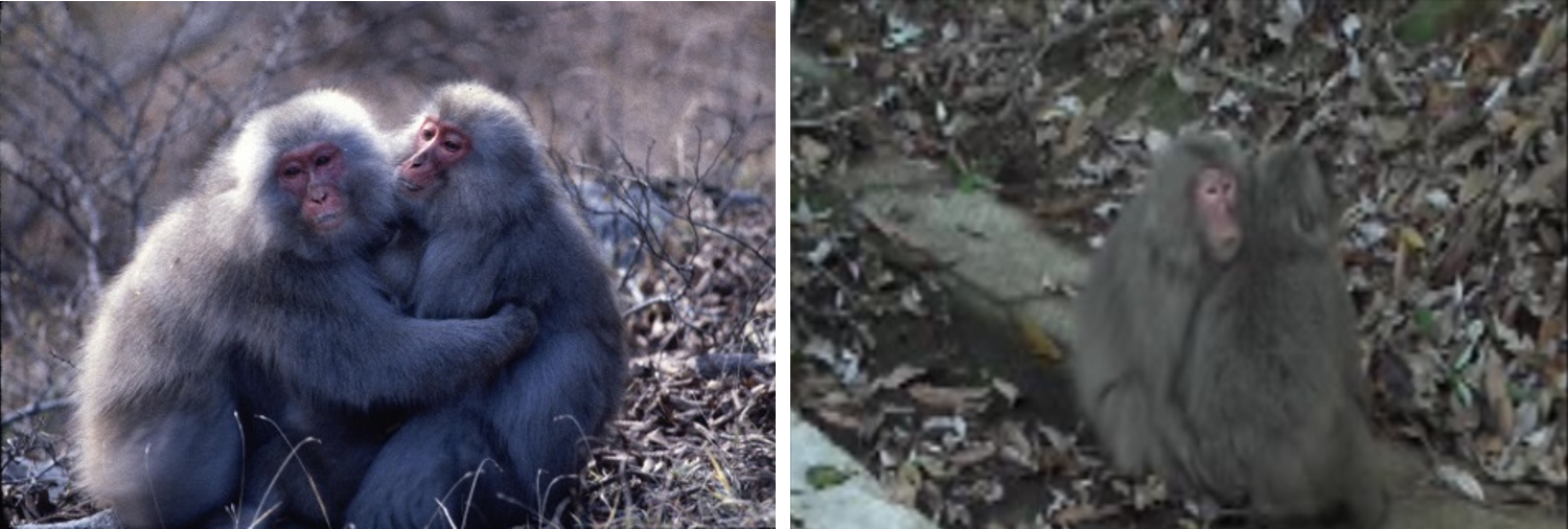 写真左:金華山のニホンザルの対面抱擁、写真右:屋久島のニホンザルの体側抱擁