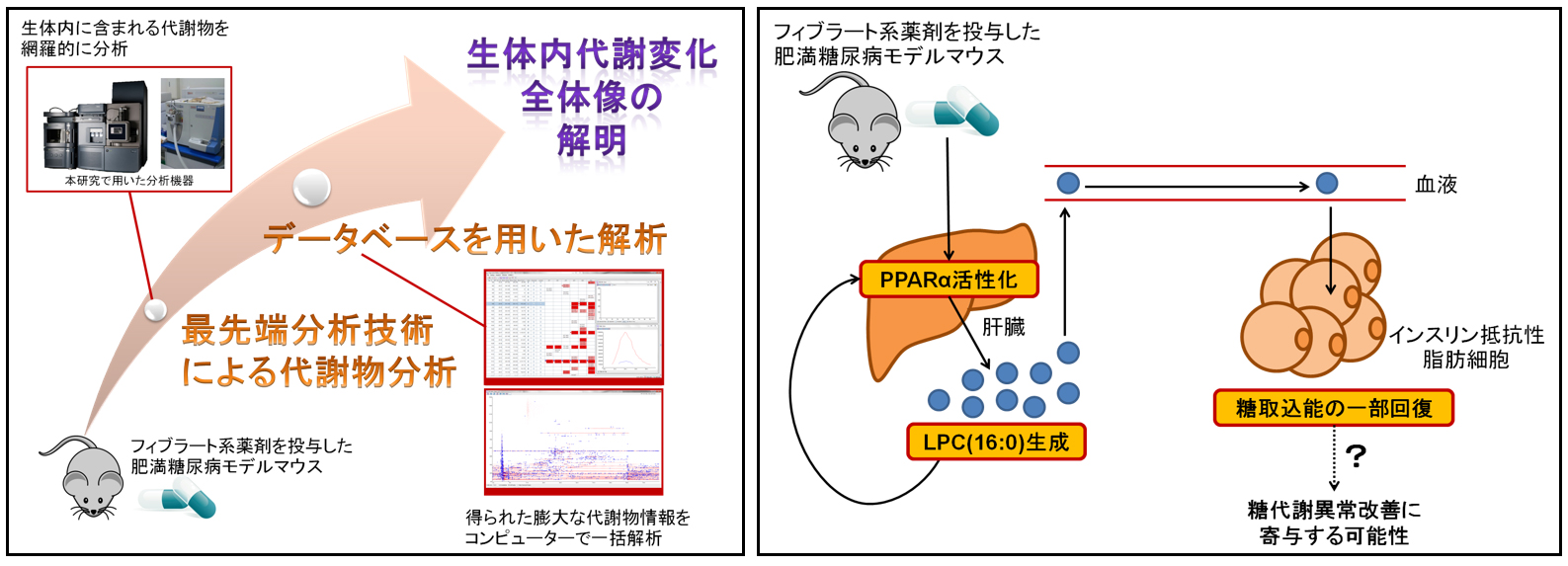 高橋春弥 農学研究科研究員、後藤剛 同准教授、河田照雄 同教授らの研究グループは、かずさDNA研究所と共同研究を行い、最先端の分析技術であるメタボローム解析を駆使して、脂質代謝に重要なPPARα(ペルオキシソーム増殖剤応答性受容体:peroxisome proliferator-activated receptor)を活性化した際に、肥満・糖尿病モデルマウスの血中代謝物にどのような変動が生じるのか、その網羅的解析を行いました。その結果、脂質異常症治療薬投与によりPPARαを活性化させた際の血中代謝物変動の全体像を明らかにすると同時に、血糖値制御作用があるLPC(16:0)と呼ばれる代謝物の血中濃度が特徴的に変動することを見出しました。また、この代謝物の生成機構と脂質異常症治療薬の新たな効き方の一端を明らかにしました。