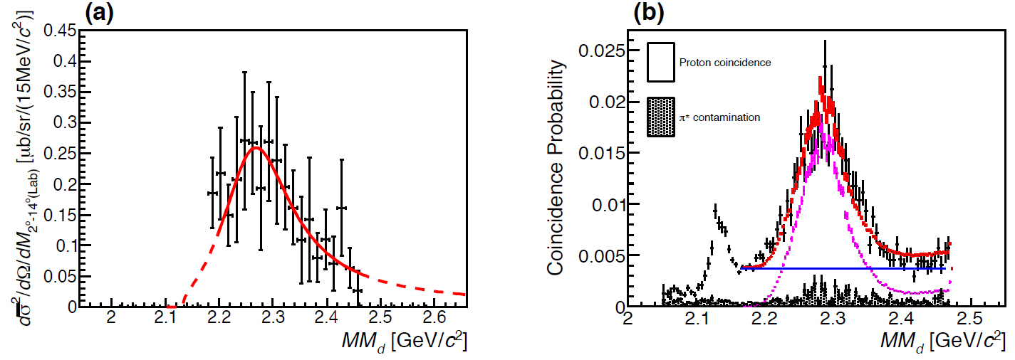 (a)陽子2個を測定した場合。赤い線のピークがK - ppの質量(約2.275GeV)に相当する。これは、K - ppの束縛エネルギーが約100MeVであることを意味する。(b)陽子1個を測定した場合にも似たような構造を観測
