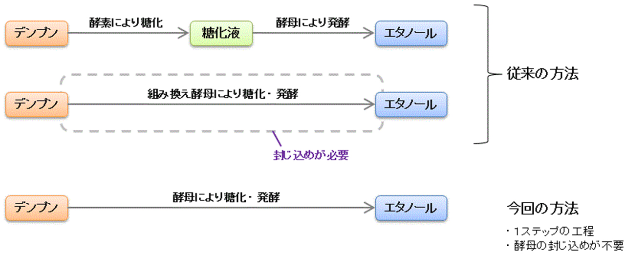 従来は、デンプンなどの多糖類からバイオエタノール生産を行う場合には、アミラーゼなどの多糖分解酵素で処理した後、酵母株 Saccaromyces cerevisiae によりバイオエタノールを生産することが一般的でした。多糖分解酵素処理は、高コストの要因となり得ることから、多糖分解処理を必要としない一気通貫プロセスの開発が望まれていました。また、遺伝子組み換え株を用いる技術は開発されていましたが、遺伝子組み換え株を用いた場合には物理的な封じ込めが必要になるため、生産プロセスが煩雑になるという問題がありました。