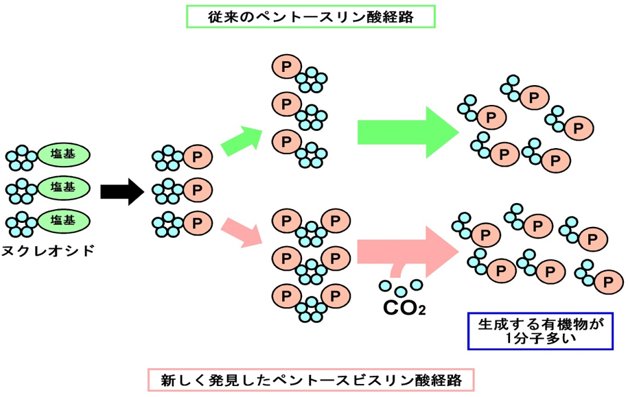 ルビスコの炭酸固定能により本経路では、ヌクレオシドに由来するペントースからの中央糖代謝産物の生成量が従来のペントースリン酸経路と比べて増加します。ペントースビスリン酸経路は真核生物の祖先と考えられているアーキアに存在することから、その発見はカルビン回路の誕生や進化を考える上で大きな手がかりを与えるものです。