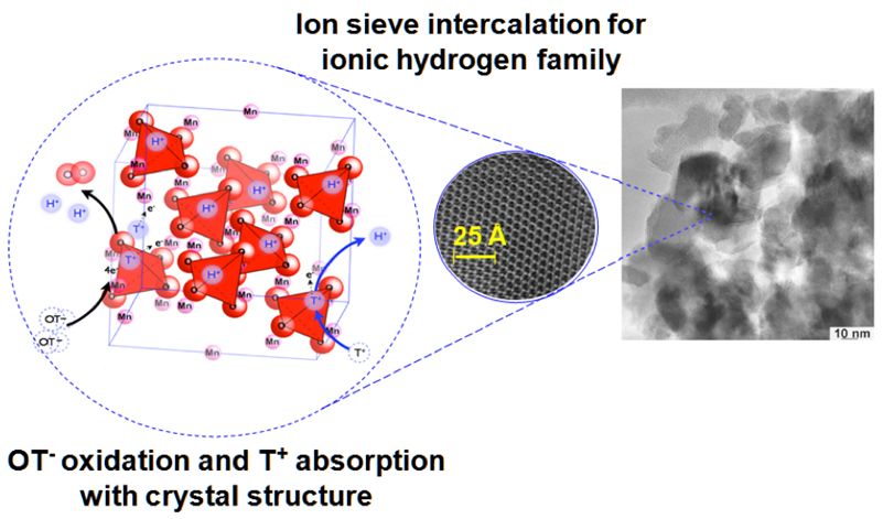 本研究では、電池材料としてよく知られている酸化マンガンの結晶構造と、その水素イオン(H + )含有量を制御してトリチウムを含んだ水に接触させると、水中のトリチウム濃度が顕著に低下する現象を発見しました。このトリチウム濃度の顕著な低下は、酸化マンガンの表面でトリチウム水が酸化分解されてトリチウムイオン(T + )が発生し、発生したT + が結晶内に吸収される反応に基づきます。この化学反応を利用して、処理水中のトリチウム濃度が低下したタイミングでトリチウムを吸収した酸化マンガンを処理水から固液分離することによって、トリチウムを室温の水から分離・除去することを可能にしました。