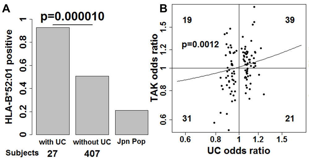 (A)HLA-B*52:01を持つ合併例(TAK,UC)・非合併例(TAK)・一般日本人の割合