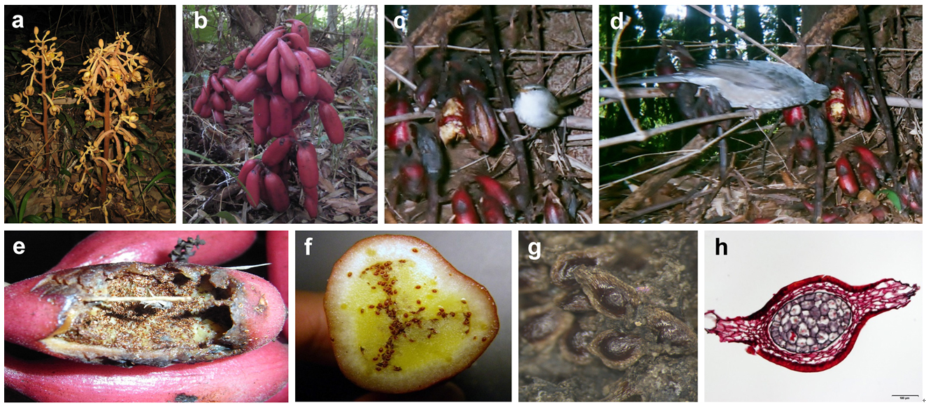 図:(a)ツチアケビ植物体(花期)、(b)ツチアケビ植物体(結実期)、(c)ツチアケビ花茎につかまるウグイス、(d)ツチアケビ果実を摂食するヒヨドリ、(e)ヒヨドリに摂食されたツチアケビ果実、(f)ツチアケビ果実の切片、(g)ヒヨドリ糞中のツチアケビ種子、(h)ツチアケビ種子の切片(リグニン化した種皮がサフラニンで赤く染色されている)