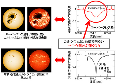 (左) 可視光とCa II線で見た太陽の観測画像(Big Bear Solar Observatoryによる観測データ)とスーパーフレア星を可視光とCa II線で見た場合の想像図。大きな黒点の周囲は、Ca II線で見ると明るくなっています。(右)電離カルシウム(Ca II 854.2[nm])の吸収線。スーパーフレア星(上のスペクトル)は、太陽(下のスペクトル)と比較して、中心部分が浅く(明るく)なっており、巨大黒点の存在が示唆されます。