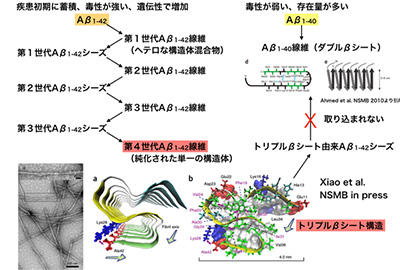 これまで、Ab1-42の方がAb1-40に比べて凝集体を形成しやすいこと、形成された凝集体の毒性が高いことが解っており。さらに、疾患初期に認められる老人斑ではAb1-42から形成されていること、遺伝的な家族性のアルツハイマー病ではAβ1-42の形成効率が高まることなど、Aβ1-42の方がより発症を促進している可能性が示唆されていましたが、それが分子レベルではどういう違いをもたらしているかは全く解りませんでしたが、本成果は、その違いについて初めて分子レベルで解き明かすことに成功しました。さらにそれだけではなく、Aβ1-42による構造はAβ1-40に伝播されないことを初めて明確に示したことで、アルツハイマー病の初期において、1カ所で凝集が起きれば、配列に依存して構造が増幅されていく可能性を提示しました。