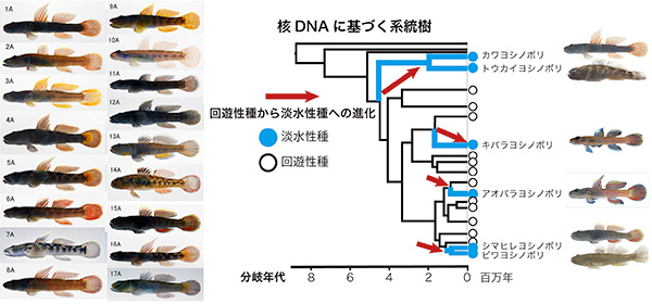 日本産ヨシノボリ類の種多様性(写真:雄、鈴木寿之撮影)と核DNAに基づく系統関係。回遊性種から淡水性種への進化が4回以上生じたと推定された。