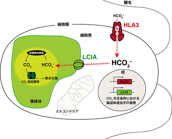緑藻クラミドモナスのモデル図と、今回明らかにしたHLA3とLCIAによる重炭酸イオンの輸送経路(赤点線)