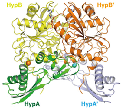 研究グループは、水素分子の可逆的な酸化反応を触媒するヒドロゲナーゼに、正確にニッケルイオンを組み込むHypAと、そのパートナー分子であるATP加水分解酵素HypBについて、これらが一時的に形成する複合体の原子分解能での立体構造を、X線結晶解析によって解明しました。HypAはHypBと複合体を形成することによって、その立体構造が大きく変化し、HypAの分子内でニッケルイオンの結合部位が形成されることが分かりました。その結果、ニッケルイオンに対する親和性が約600倍も上昇し、生体内の微量なニッケルイオンを取り込めるようになることが明らかになりました。またHypAとHypBの複合体の形成と解離は、HypBの触媒するATP加水分解サイクルに伴って制御されていることが分かり、HypAがHypBから解離してニッケルイオンに対する親和性が低下することで、ニッケルイオンがヒドロゲナーゼに組み込まれることが示唆されました。