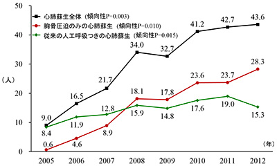 結果は、胸骨圧迫のみの心肺蘇生を受けた人の割合は2005年17.4%から2012年39.3%、心肺蘇生全体(胸骨圧迫のみの心肺蘇生もしくは人工呼吸つきの心肺蘇生のいずれか)では34.5%から47.4%と大きく増加していました(両傾向性P<0.001)。また、胸骨圧迫のみの心肺蘇生によって社会復帰したと推計される院外心停止者数(人口1000万人あたり)は2005年の0.6人から2012年には28.3人(傾向P=0.010)、心肺蘇生全体では9.0人から43.6人(傾向P=0.003)へと有意に増加していました(図)。