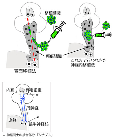 当初の研究では従来から広く行われている細胞移植法を採用し、細い注射針などを神経組織に刺して、細胞を神経内部に注入しました(神経内移植法)が、注入された細胞は数週間後までに死んでしまいました。ところが、偶然に神経表面に漏れ出た細胞が、「自力で神経内に入り込んで生き延びる」というこれまで報告されていない現象を発見しました。そこで、次の実験では、細胞を神経内に注入するのではなく表面に置くことにし、これを「表面移植法」と名付けました。その実験の結果、表面移植された細胞は、瘢痕化した神経内に次々と入り込み、瘢痕組織を利用しながら形を変えつつ、長期間にわたって生き続けました。そして、3ヶ月後にラットに音を聞かせてみると、聴神経の機能が改善していることが明らかになりました。